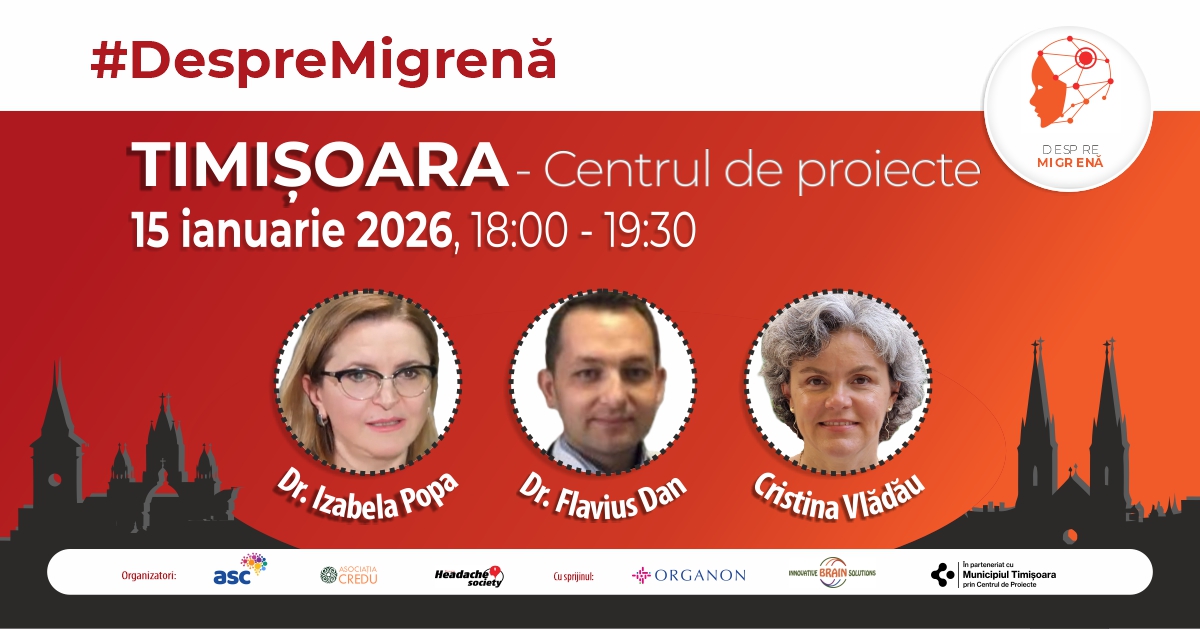 Asociația pentru Sănătatea Creierului vă invită cu deosebită plăcere să participați la evenimentul local „Despre migrenă și sănătatea creierului”, ce se va desfășura la Centrul de Proiecte Timișoara (parter), joi 15 ianuarie, 18:00 – 19:30! Scopul acestui eveniment este de a aduce informații valoroase despre această afecțiune și de a crea o platformă de dialog pentru comunitatea locală, cu privire la sănătatea creierului și impactul migrenei asupra calității vieții.